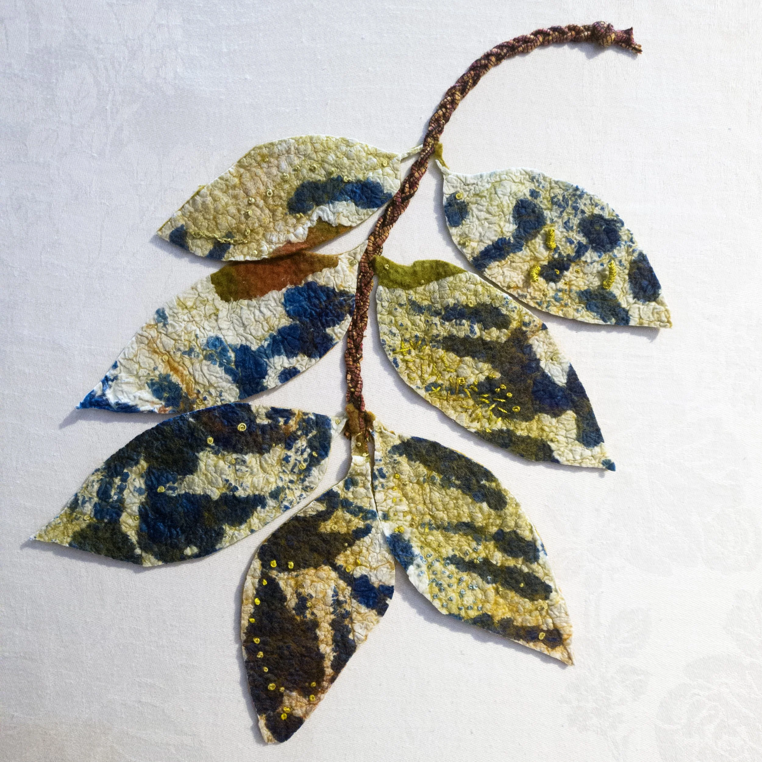Patchy blue distribution on white felt with embedded leaf skeletons