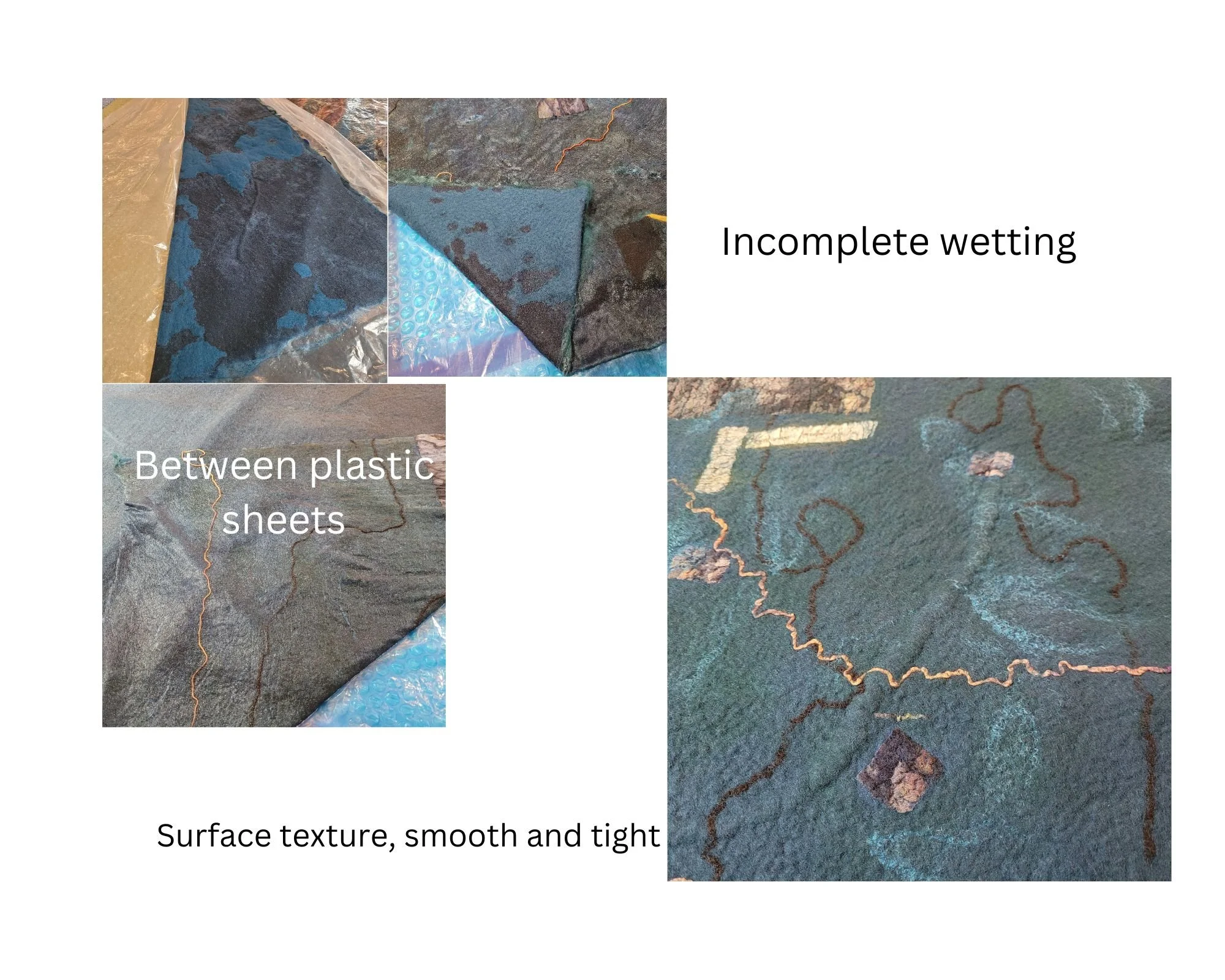 I chose to go with a fairly traditional felting route - rolling by hand and with the Gentle Roller followed by fulling by hand and using the Gentle Roller. After laying out the prefelts, roving and decorative elements on top of painter’s plastic, I wet down the work and covered it with another piece of painter’s plastic.