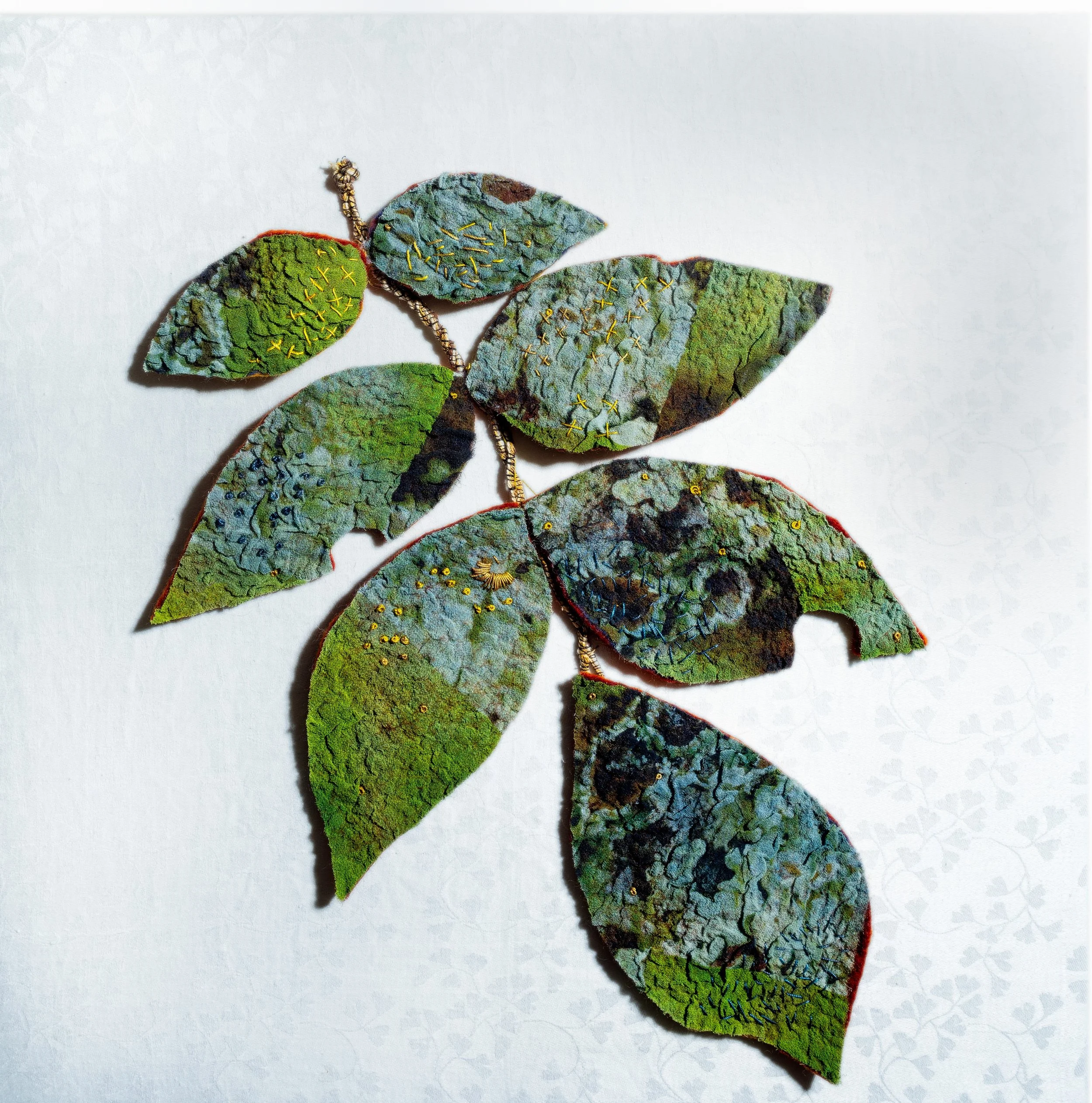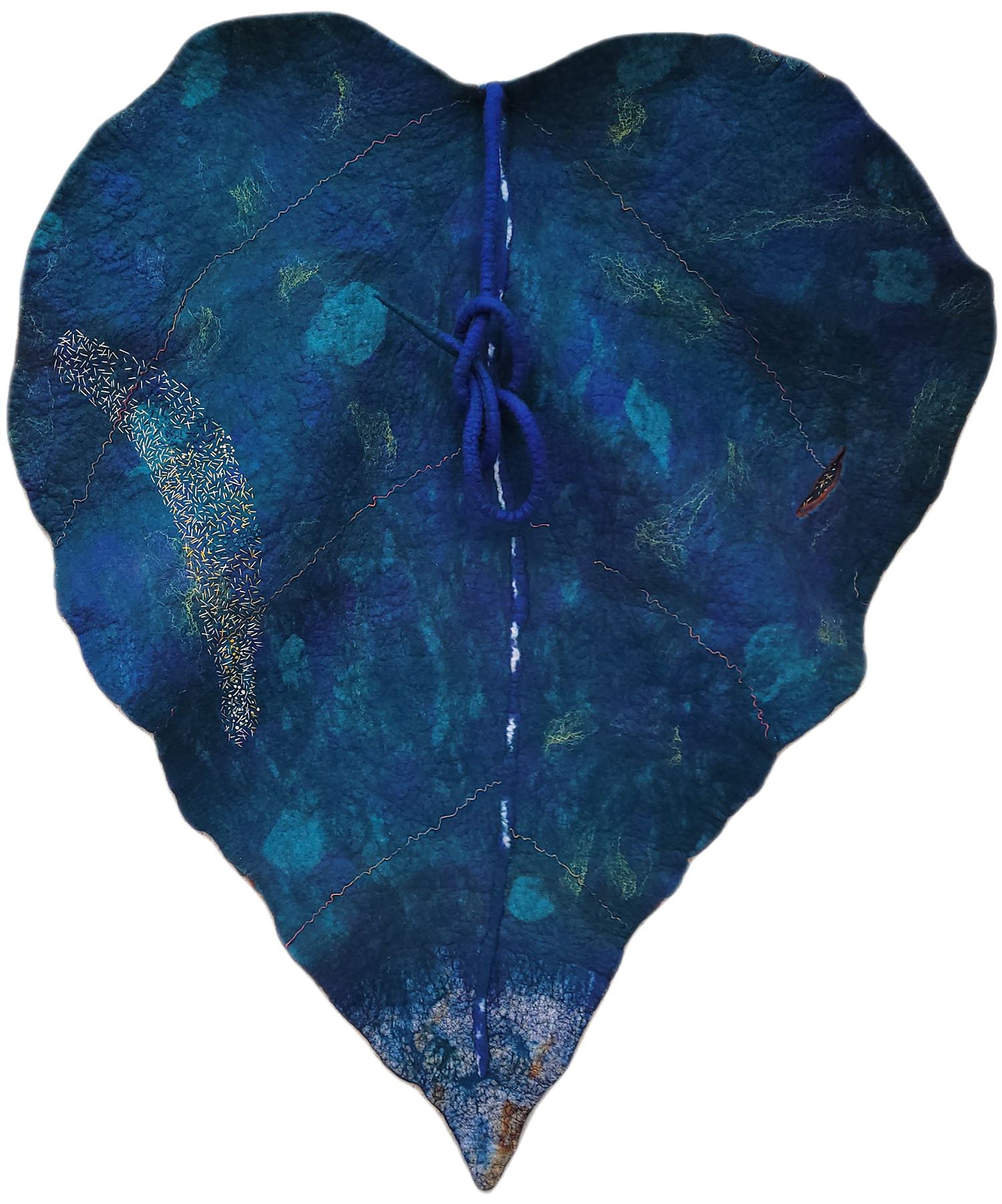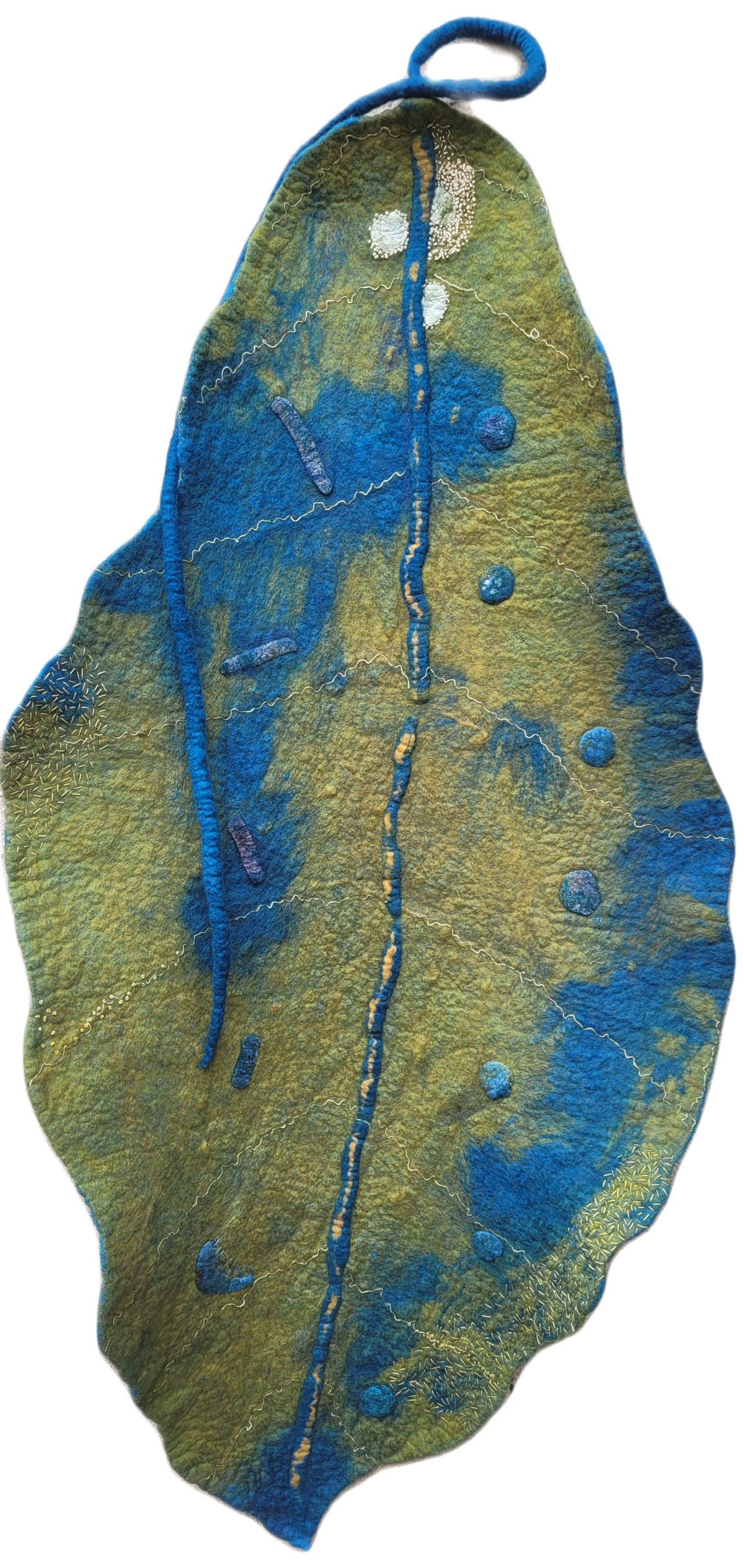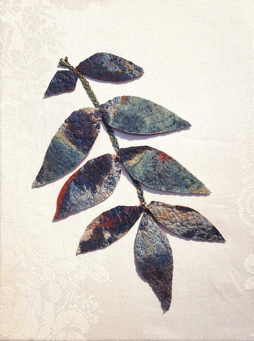 Through imagery and narrative, I am sharing my perspectives on a familiar plant structure, leaves. I present leaves of Ontario’s trees in diverse and unexpected ways to reveal some of their superpowers, vulnerabilities, and connections between the vitality of leaves and human activities. Sheila’s multicoloured, large felt leaves present extreme future responses to human-induced changes in habitat and climate. Pinnate leaves called for a different felting technique due to their complexity. These are reconstructions of an actual leaf, measured and cut from Sheila’s own upcycled remnants of nuno or paper felts - reimagined with lichen print surfaces, multicoloured, blue - responding to unknown environmental conditions in 2050.