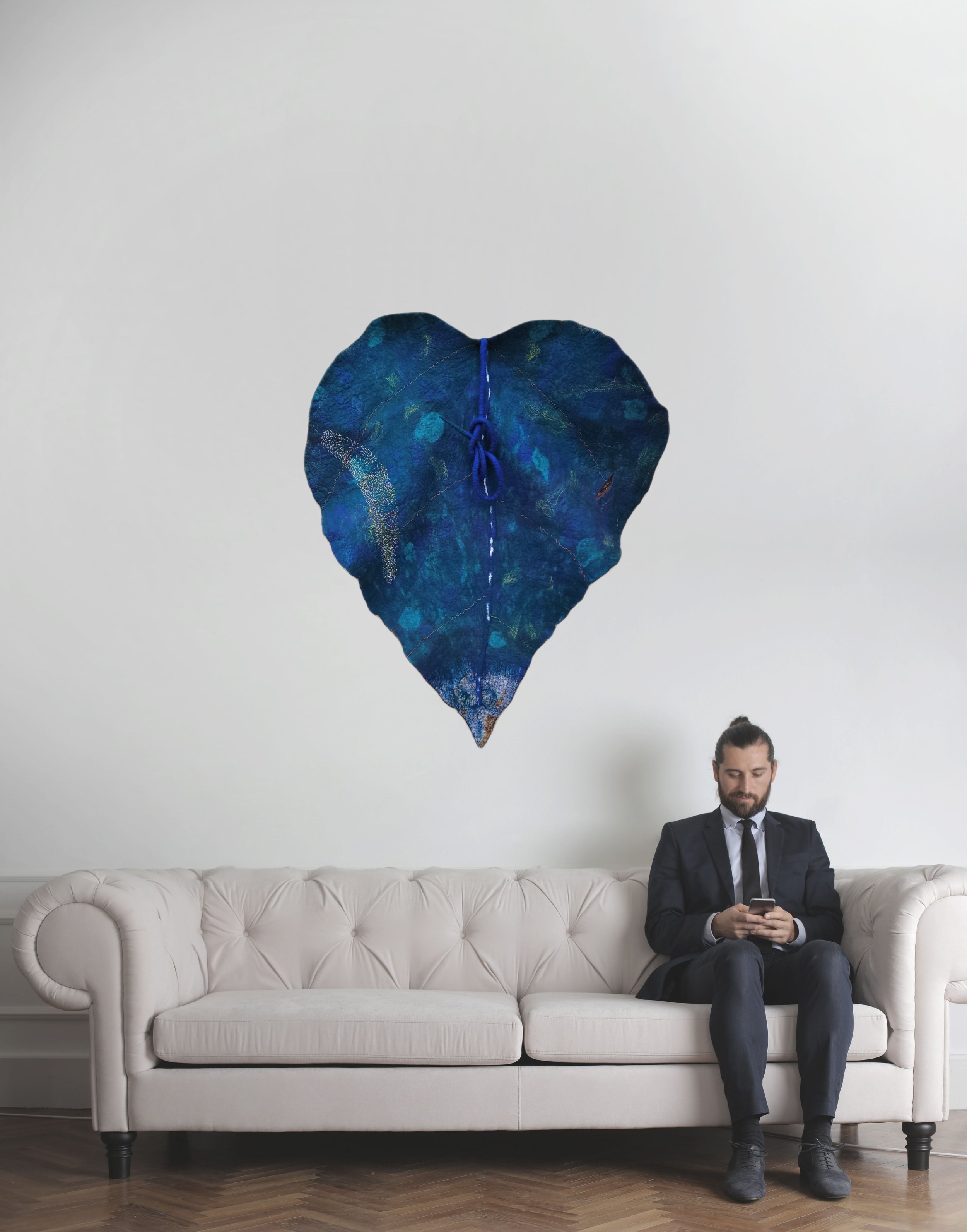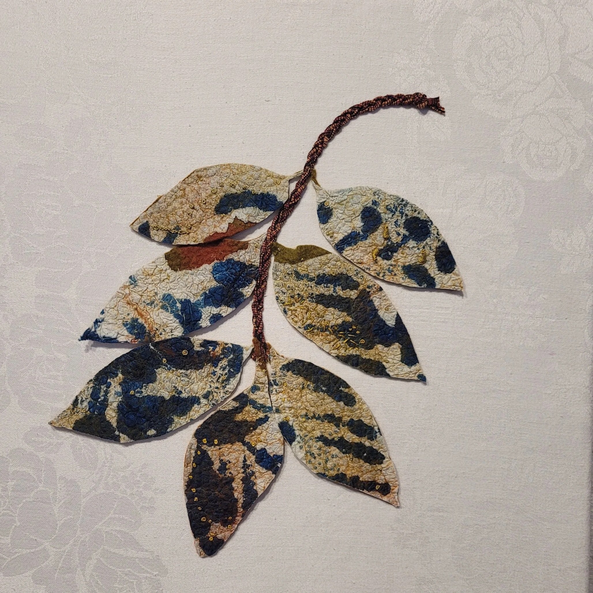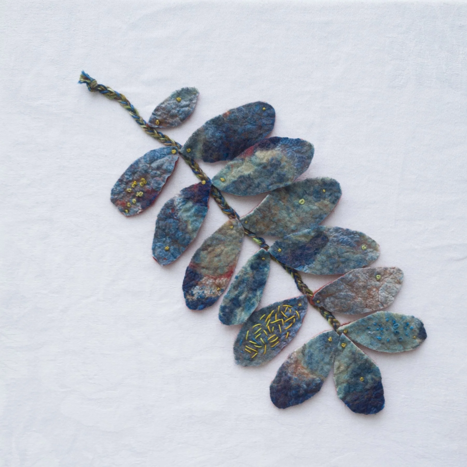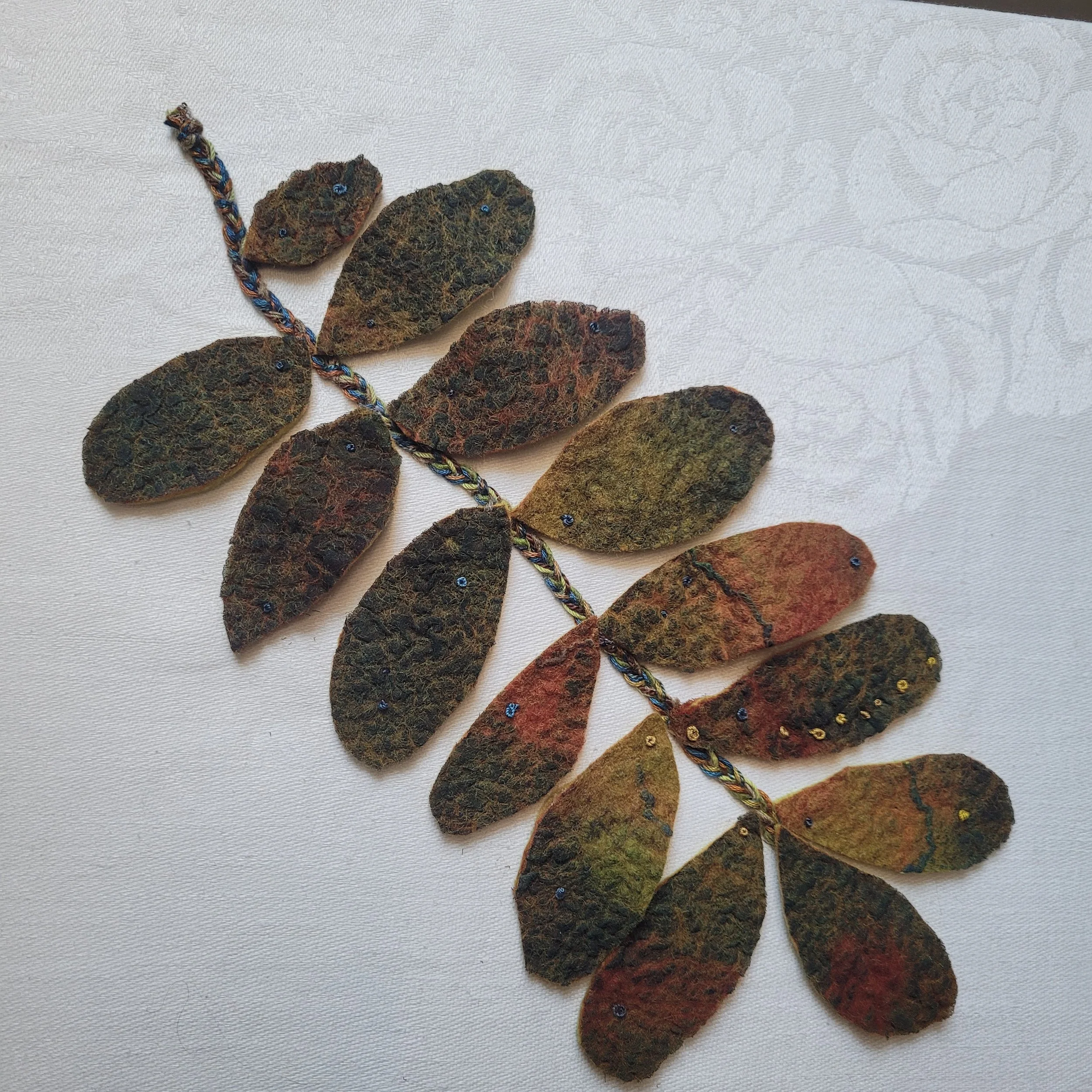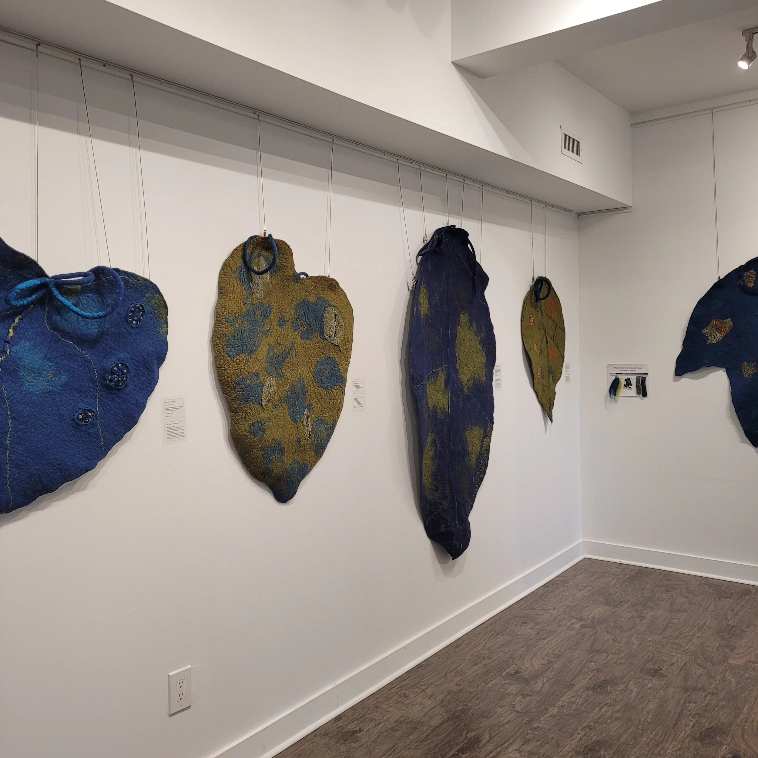Through imagery and narrative, I am sharing my perspectives on a familiar plant structure, leaves. I present leaves of Ontario’s trees in diverse and unexpected ways to reveal some of their superpowers, vulnerabilities, and connections between the vitality of leaves and human activities. Sheila’s multicoloured, large felt leaves present extreme future responses to human-induced changes in habitat and climate. Pinnate leaves called for a different felting technique due to their complexity. These are reconstructions of an actual leaf, measured and cut from Sheila’s own upcycled remnants of nuno or paper felts - reimagined with lichen print surfaces, multicoloured, blue - responding to unknown environmental conditions in 2050.