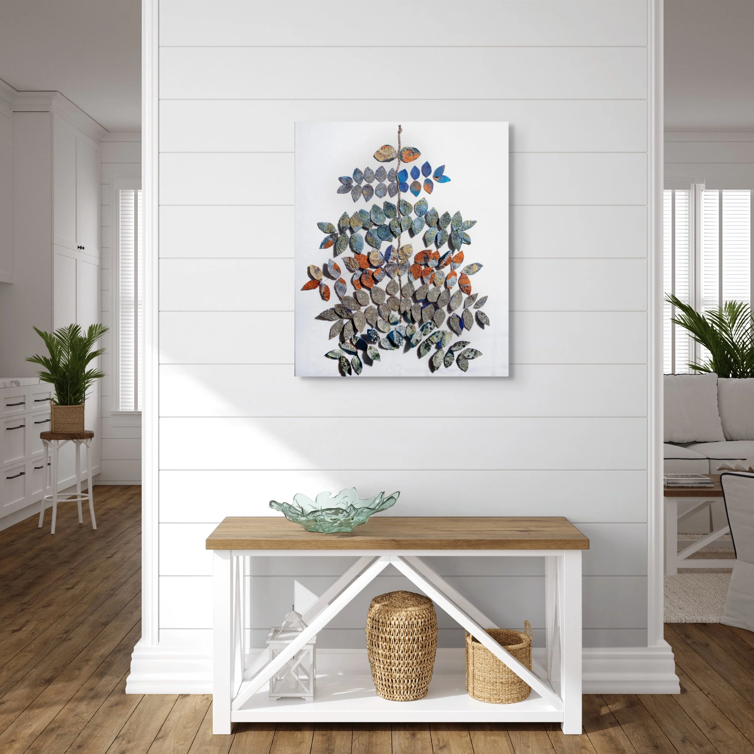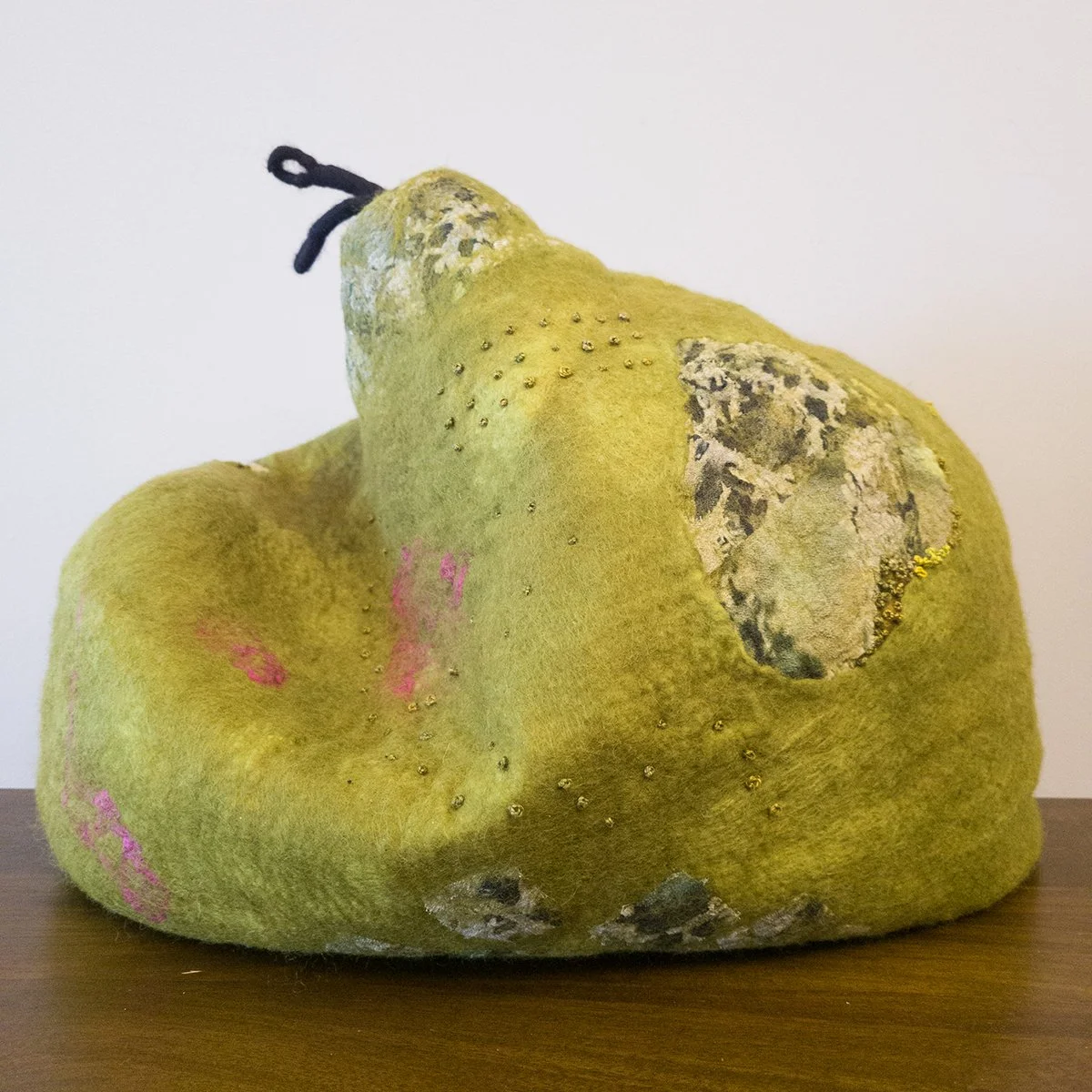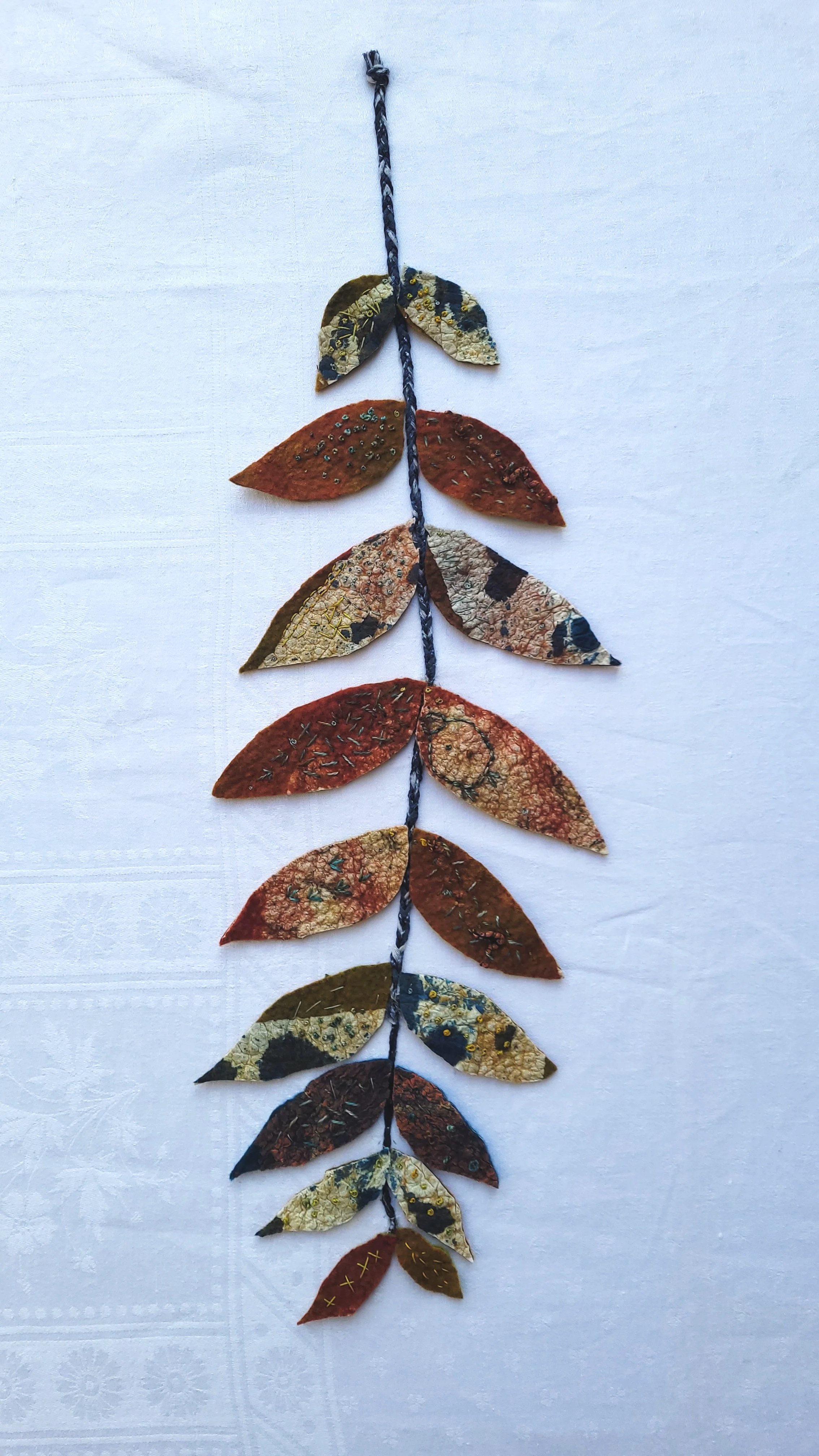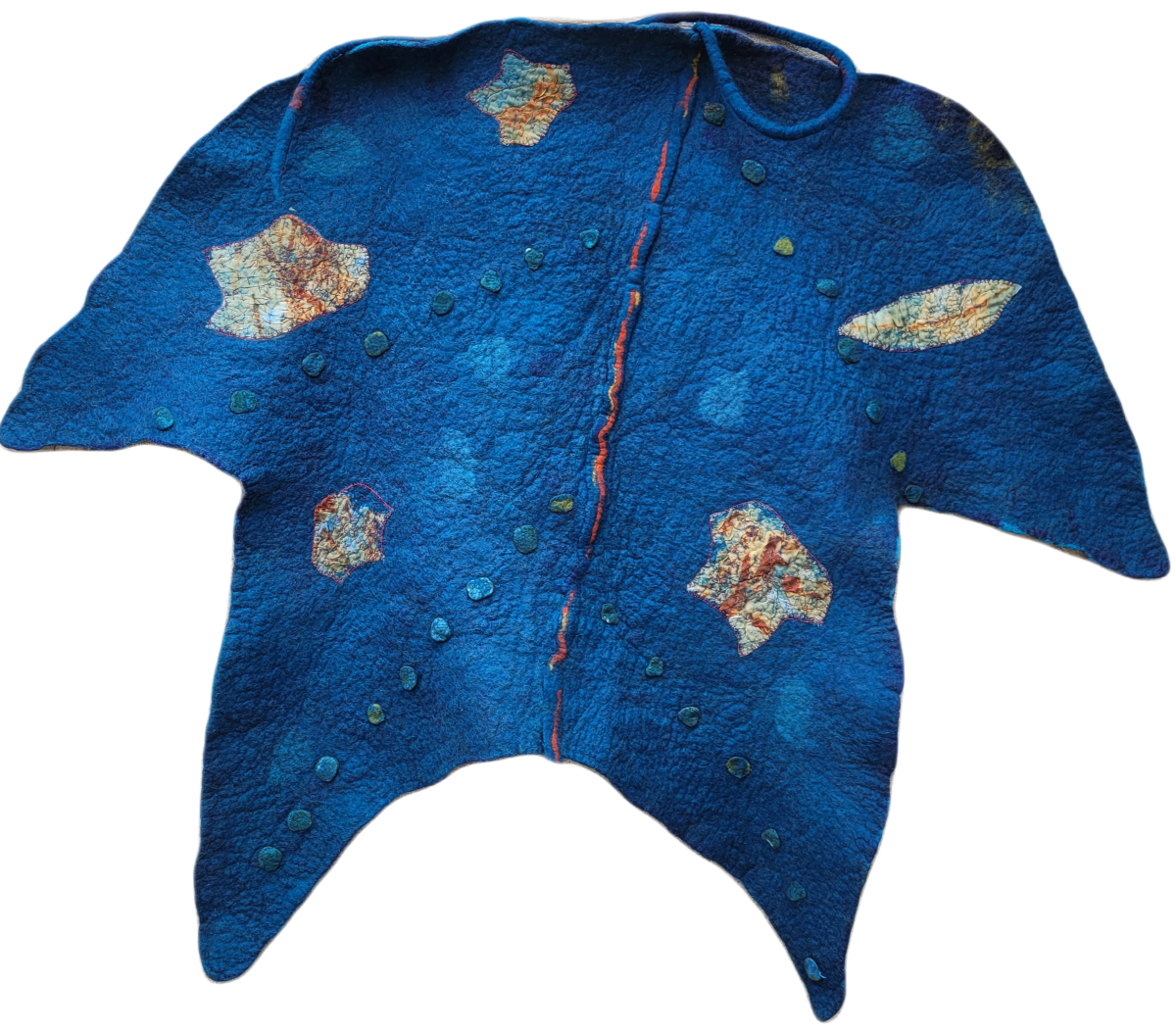 Through imagery and narrative, I am sharing my perspectives on a familiar plant structure, leaves. I present leaves of Ontario’s trees in diverse and unexpected ways to reveal some of their superpowers, vulnerabilities, and connections between the vitality of leaves and human activities. Sheila’s multicoloured, large felt leaves present extreme future responses to human-induced changes in habitat and climate. Pinnate leaves called for a different felting technique due to their complexity. These are reconstructions of an actual leaf, measured and cut from Sheila’s own upcycled remnants of nuno or paper felts - reimagined with lichen print surfaces, multicoloured, blue - responding to unknown environmental conditions in 2050.